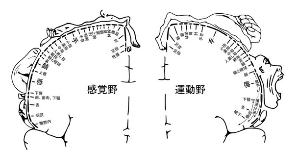 上記図は、ホムンクルスの図と言い、脳の中の動作を司る「運動野」と感覚を司る「感覚野」の範囲や外周は脳が体のどの部分と密接につながっているかを表しています。